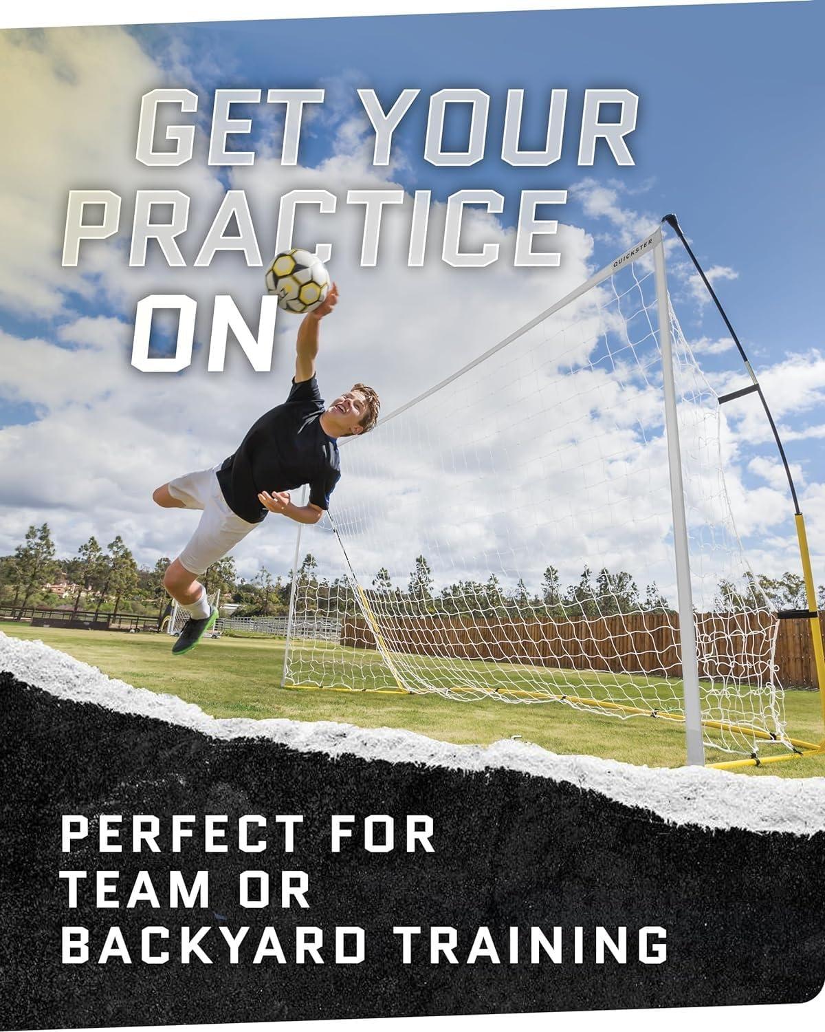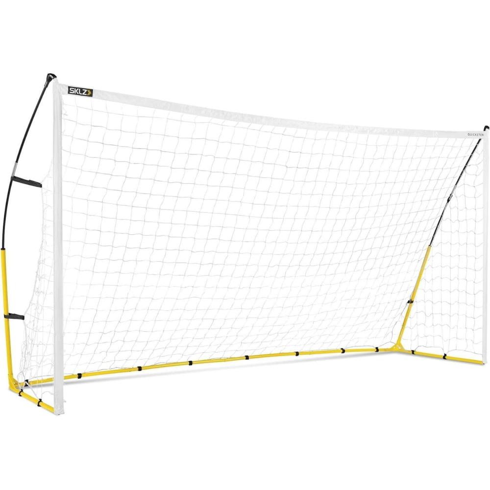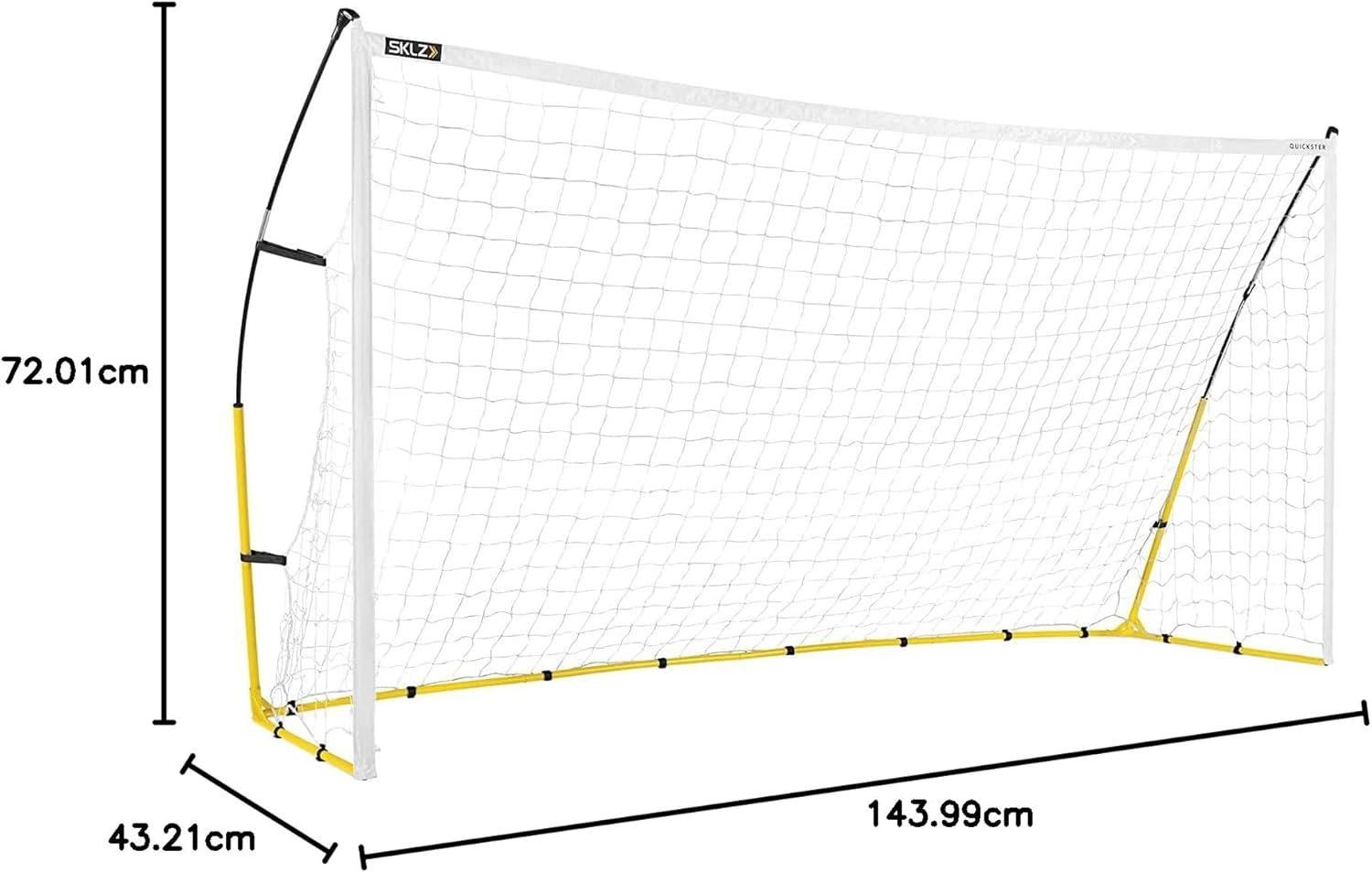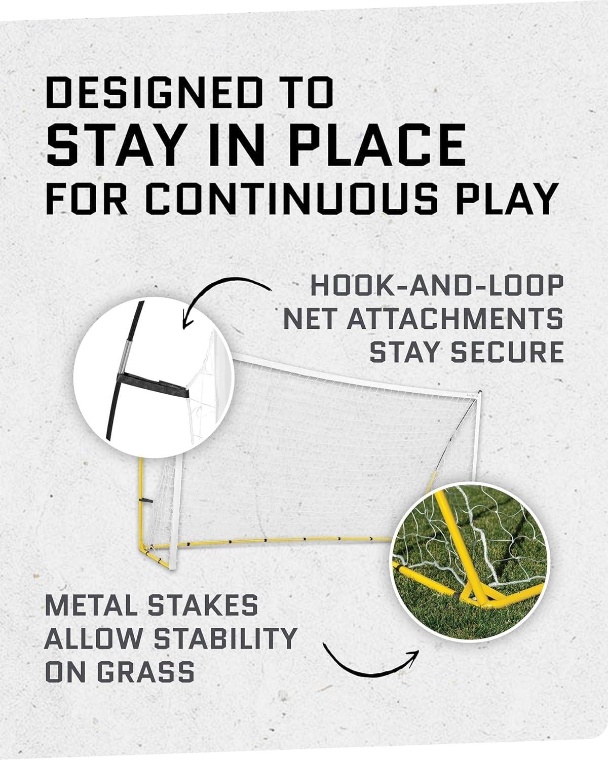 Don't miss out on valuable practice time with the SKLZ Quickster Soccer Goal and net. Whether you're a novice or elite soccer player, this portable soccer goal lets you hone your shooting accuracy, practice your ball control to become the player you've always aspired to be. This soccer goal and net easily transforms your backyard into a soccer training field so you can practice your skills at home. Thanks to its heavy gauge frame, reinforced corners, and ultra-durable 2-ply netting, this backyard soccer goal is built to withstand high-intensity training, kick after kick, eliminating the need for frequent net replacements. The innovative Tension-Tite Poles and click-lock tubing ensure a secure and stable frame for fast, easy setup, while the hook-and-loop net attachments keep the soccer net in place, even during powerful shots, so you can stay focused on perfecting your skills. Additionally, this outdoor soccer goal includes metal stakes to provide stability on grass or other surfaces, ensuring your goal stays put. The lightweight SKLZ Quickster Soccer Goal also comes with its own carrying case with built-in handle, making it easy to transport to the field or your backyard for soccer practice whenever you want.