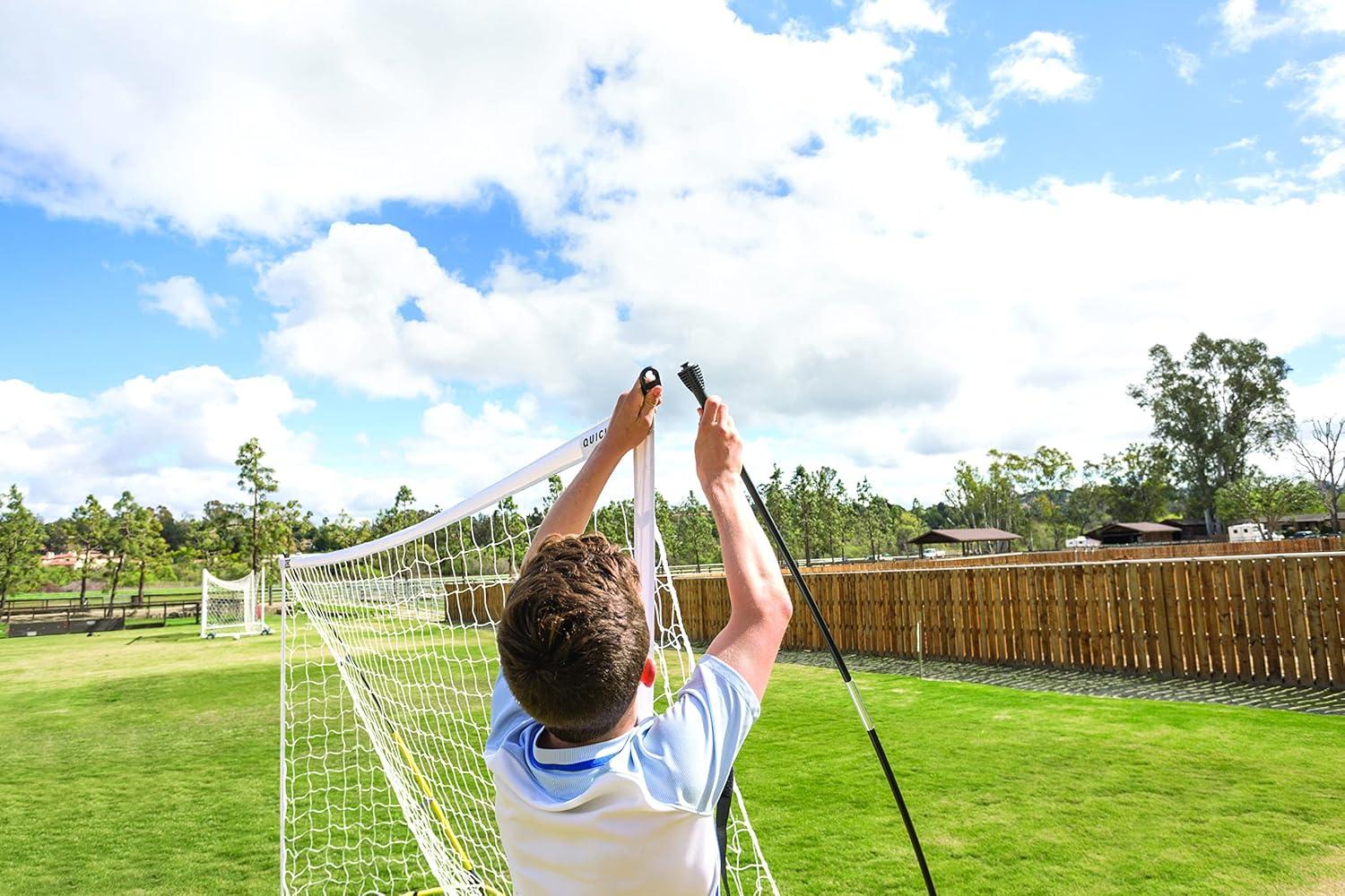 PORTABLE GOAL sets up and breaks down in under 2 minutes; the unique Tension-Tite poles create a sturdy frame, while the easy velcro net attachments and steel ground stakes ensure the net will stay put.