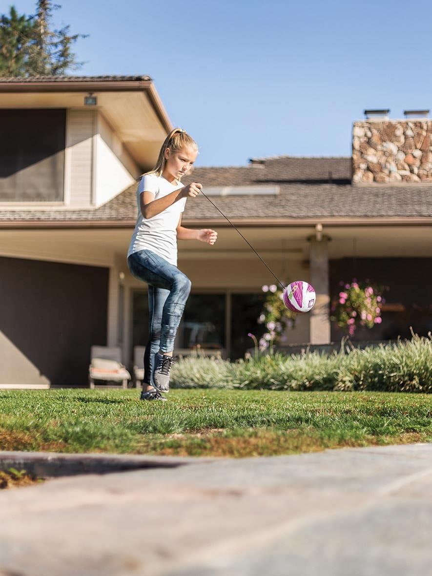 Ball is attached by a 5-foot adjustable cord to an ergonomic, compact handle; excess cord stores in the handle during use or transportation